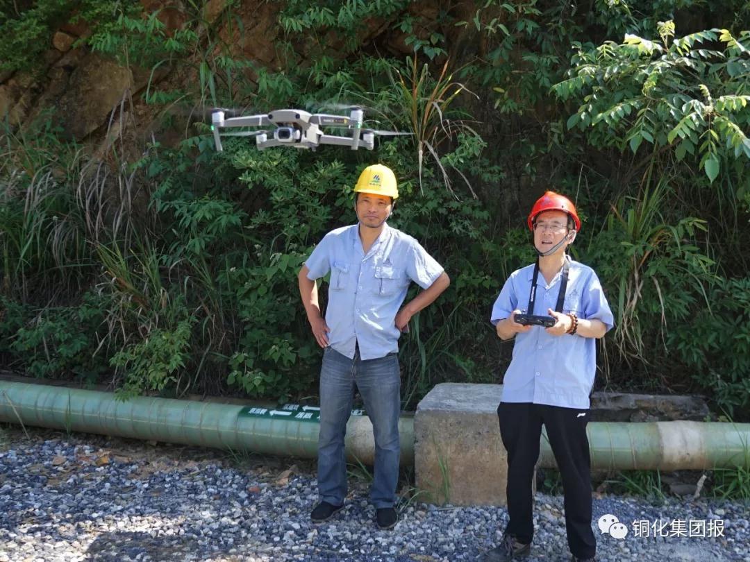 5月24日,新橋礦業(yè)公司露采工區(qū)環(huán)保員羅健(左)和無人機操作員王夫谷來到該公司四房排土場,首次利用無人機從空中拍攝該區(qū)域環(huán)境整治情況?!√丶s記者 肖邦魁/ 攝
